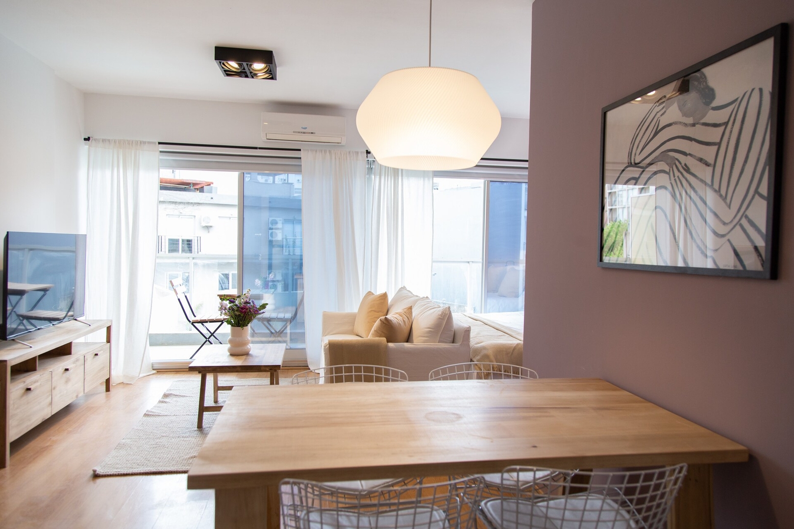 Kigelia Deluxe Studio es un acogedor y luminoso monoambiente en Palermo, perfecto para 2 huéspedes. Combina estilo moderno con comodidad, e incluye acceso a pileta y gimnasio en el edificio. Gracias a su ubicación privilegiada, podrás disfrutar fácilmente de los mejores bares, restaurantes y propuestas culturales de Buenos Aires.